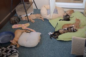 Die Wohnung haben wir nun auch komplett in Beschlag genommen und dürfen uns überall frei bewegen. Das ist toll und auch die grossen Katzen hier sind ganz lieb zu uns. Wir haben sogar in Diggi ein Ersatzmami gefunden, dass uns noch so gerne putzt und uns sogar an ihre Zitzen lässt, obwohl sie gar keine Milch hat. Doch wir zwei sind schon Gross und brauchen das nicht, einige andere Kitten hier geniessen jedoch diese Fürsorge von Diggi sehr.