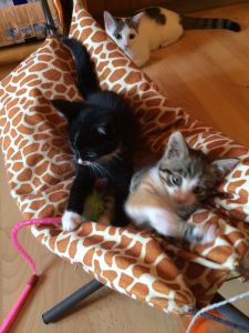 Satinka und Manapi haben ihre Scheu komplett abgelegt und gehen bereits ein wenig auf die Menschen zu. Satinka ist sogar schon auf den Schoss von Manu geklettert und hat so ihren Mut bewiesen.