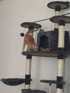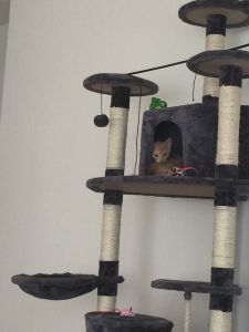 Ein neues Hobby das nun alle von uns entdeckt haben ist, dass wir mit Wonne auf die kleinen und grösseren Kratzbäume klettern und oben wie eine Statue sitzen und um uns herum alles begutachten. Das ist cool, denn so hat man eine tolle Aussicht und kanns wirklich geniessen