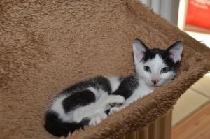 Chumani hat sich schon in der Höhle des Kratzbaums streicheln lassen und Leckerli aus der Hand gefressen.