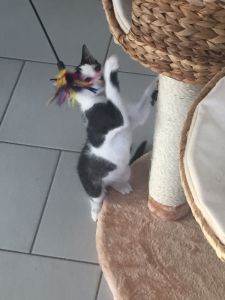 Gestern haben Manu und ich ausgiebig gespielt, das war cool. Sie musste mich in ein Zimmer locken und die Türe schliessen, denn sonst hätte ich gegen die Jungspunde keine Chance gehabt. So konnte ich relaxt und intensiv der Federangel nachjagen und sie mit meinen Pfötchen und Zähnchen halten. Immer wieder wurde an der Angel gezupft damit ich sie loslasse und dann ging das Spiel von vorne los