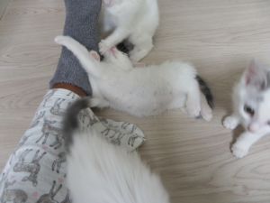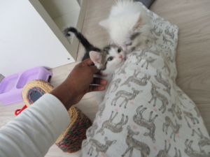 Schon am fünften Tag durfte unser Pflegemami zwei von uns streicheln und nur Alice war noch ängstlich und zog sich zurück.