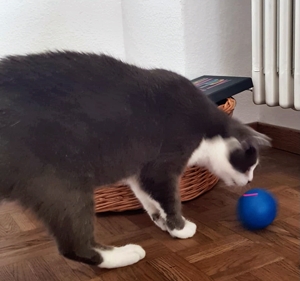Ich mag immer wieder neue Spiele, kleinen Überraschungen und interessante Spielsachen. Das neuste Geschenk ist ein Ball, der sich selbständig durch den Raum bewegt. Ganz durchschaut habe ich das neue Spielzeug noch nicht