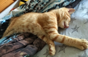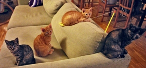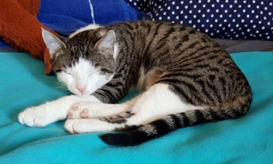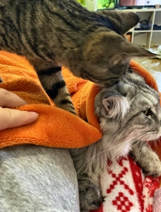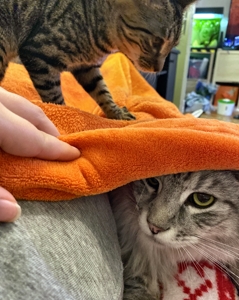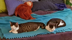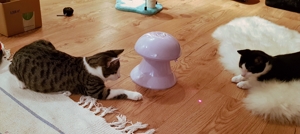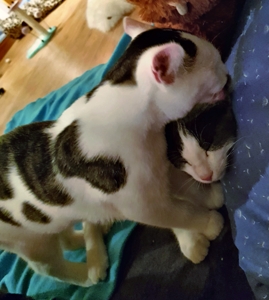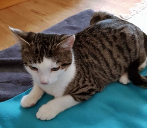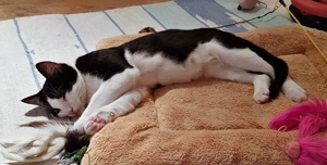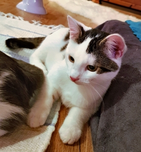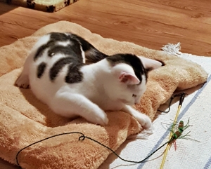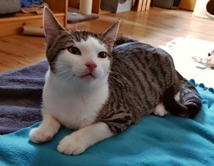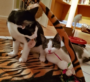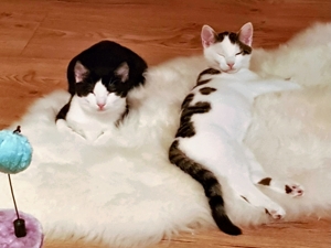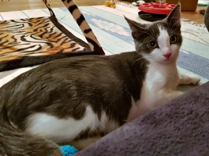 . Inzwischen machen meine Geschwister dabei mit. Wenn ich nicht gerade in Spiellaune bin, dann bin ich sehr verschmust, am liebsten mag ich es auf dem Rücken gestreichelt zu werden.
