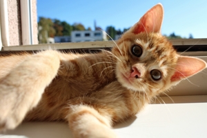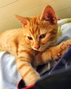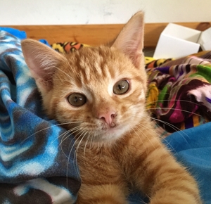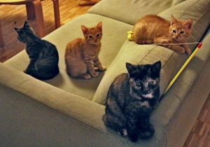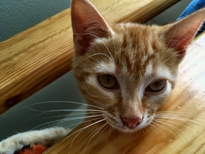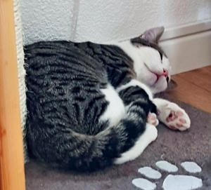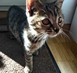 Ich bin der Mutigste von allen und zeige den anderen was ich entdecke. Zum Beispiel habe ich herausgefunden, dass es ausserhalb des Katzenzimmers noch weiter geht. Immer wenn mein Pflegefrauchen reinkommt, renne ich ihr zwischen den Beinen durch und erkunde den Rest der Wohnung