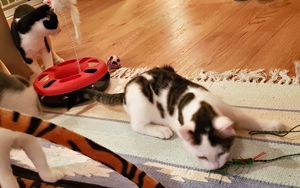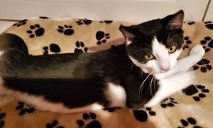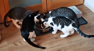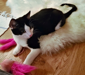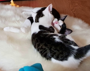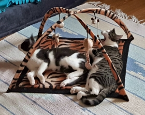 Doch nun habe ich mich wieder gefangen und schmuse so viel wie immer. Jamie ist mein bester Kumpel und wir spielen jetzt noch zu zweit. Nun helfen auch die beiden ausgewachsen Kater manchmal spielen. Vorher war es diesen beiden meistens zu wild mit uns Kitten.