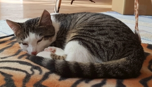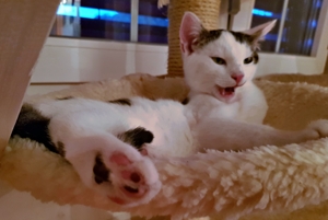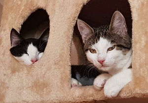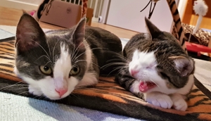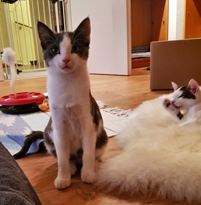 Uns geht es hier in der Pflegestelle super. Wir haben unsere Plätze schon längst gefunden und kommen mit allen anderen Büsi hier klar. Dennoch zeigen wir, dass wir aneinander hängen obschon wir keine Geschwister sind. Gerade ich, Tiny liebe es mit Railay quer durch die Wohnung zu springen und Fangen zu spielen