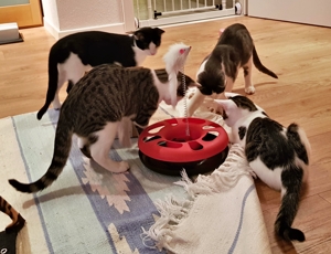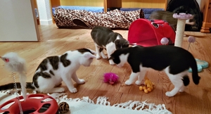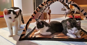 . Auch der Katzenbaum und Kartonboxen sind bei den Kleinen sehr beliebt. Dort lieben sie es ihre Zeit zu vertreiben und lange damit zu spielen. Danach ist für die vier immer Kuschel- und Schlafenszeit. In einer Spanne von 5 Minuten sind alle auf einmal müde und gönnen sich ein Schläfchen um ihre Batterien zu laden.