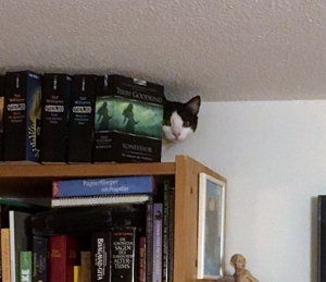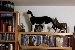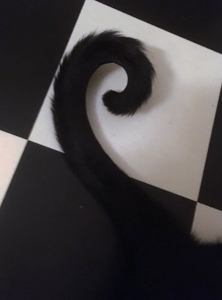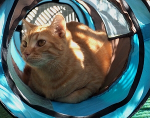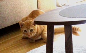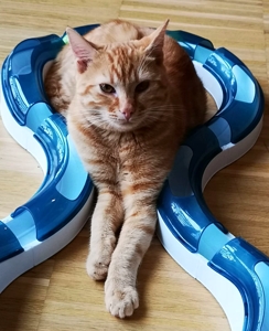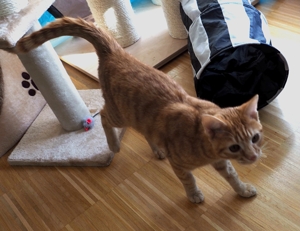 Wenn dann die Sendung fertig ist, spiele ich weiter. Ich habe so einen tollen Parcours entdeckt. Zuerst renne ich über das Sofa, knapp am Kopf vom Pflegemami vorbei, springe auf den Glastisch, der so schön klirrt, dann hinunter durch den Rascheltunnel, wieder auf’s Sofa, ein weiter Sprung auf den Katzenbaum und von dort auf den Dachbalken. Oben angekommen schaue ich zum Pflegemami hinunter, die auf dem Sofa sitzt und sich jedesmal krumm lacht