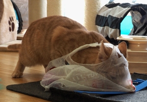 Er hat bisher alle Behandlungen geduldig über sich ergehen lassen und inzwischen geht es ihm so gut, dass in wenigen Tagen sein schlimmes Auge operiert werden kann. Er sieht mit dem Auge, aber durch die heftige Entzündung sind die Lider teilweise zusammengewachsen, was sein Sehfeld einschränkt. Dadurch kann er Distanzen nicht so gut abschätzen. Das hindert ihn aber nicht daran, voller Hingabe zu spielen und herumzurennen. Er ist sehr clever, schaut vieles von seinem Bruder ab und macht ihm alles nach. Er liebt alles wo man reinkriechen oder -steigen kann, Kartonschachteln, Papiersäcke und bei meinem Besuch einmal mehr die Plastiktüte mit den Spielsachen