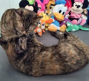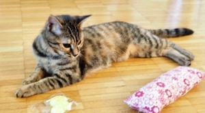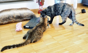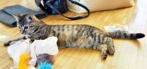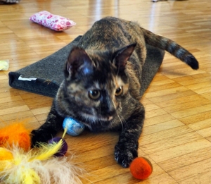 Die beiden verstehen sich gut und spielen auch sehr gerne miteinander. Wenn sie alleine spielen, dann mag Sasha zur Zeit am liebsten leere WC-Rollen.Savannah hat sich von meinen Mitbringseln ein kleines Wuschelmonster ausgesucht und während meines ganzen Besuchs hingebungsvoll damit gespielt.