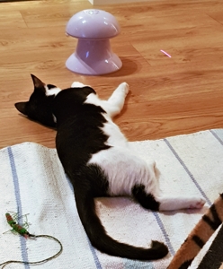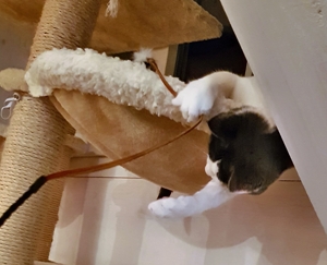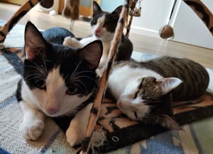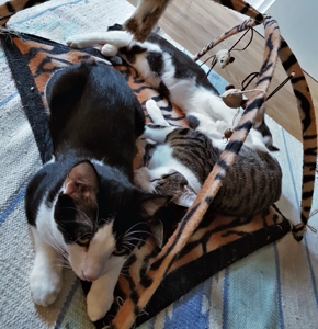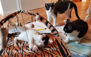. Wir lieben auch diese Stunde sehr. Das Pflegemami versucht immer, mit allen gleichzeitig zu spielen. Manchmal hat sie gleich drei Angeln in den Händen und am Boden dreht sich noch ein Spielzeug mit einem Laserpointer. Whiskers liebt es vor allem, wenn er der Spielangel auf den Kratzbaum nachklettern kann. Bakari jagt allem nach, was sich bewegt und Aliano und ich sind immer fasziniert, wenn sich unter dem Teppich etwas bewegt. Das wollen wir dann unbedingt fangen.