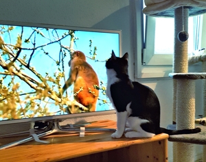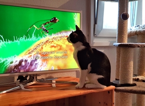 Wenn das Pflegemami mal zu früh am Abend mit uns spielen will, kann es gut sein, dass wir alle noch ganz verschlafen sind. Dann spielen wir manchmal liegend und sparen unsere Kräfte für die Nacht. Aliano liebt es auch, Tiersendungen im Fernsehen anzuschauen. Da sitzt er ganz nahe vor dem Fernseher und ist total darauf fixiert.