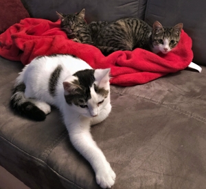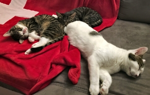 Ich habe mich sehr gut an meine neue Wohnung gewöhnt. Ich schaue oft aus dem Fenster und beobachte die Menschen draussen. Wenn ich nicht auf den Katzenbaum bin, dann verbringe ich die meiste Zeit schlafend auf dem Teppich. Mittlerweile kuschele ich mich auch an meine Artgenossen oder Pflegemami, wenn sie auf dem Sofa sitzt