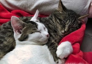 Ansonsten geht es mir super! Ich liebe es den Bällen und Spielzeugmäusen hinterherzujagen. Nur springen kann ich nicht so gut… aber dafür klettere ich wie ein Weltmeister! Die Katzenhöhle finde ich am Tollsten, da ich da in aller Ruhe meinen Tagesschlaf halten kann. Wenn ich nicht schlafe, dann spiele ich mit Happy und dann rennen wir durch die ganze Wohnung! Manchmal kämpfen wir auch, aber dann kuscheln wir meistens gleich danach nebeneinander und schlafen ein. Am liebsten würde ich gerne mit Happy einen Platz für immer finden!!