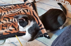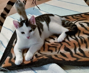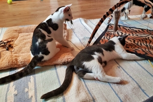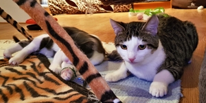 , auch wenn uns fremde Menschen noch etwas unheimlich sind. Wenn aber jemand mit uns spielt, oder gar ein paar Leckerlis gibt, verlieren wir unsere Scheu sehr schnell. Wir sind ganz lieb, verspielt und unproblematisch beim Essen. Wir kratzen nicht an den Möbeln und sind absolut stubenrein. Wir sind sicher, es gibt da draussen liebevolle neue Dosis, die viel Freude und Spass mit uns hätten. Die ganz grossen Kuschler sind wir zwar noch nicht, aber wir turnen schon mal auf dem Pflegemami herum, vor allem wenn es Leckerlis gibt. Da kennen wir nichts