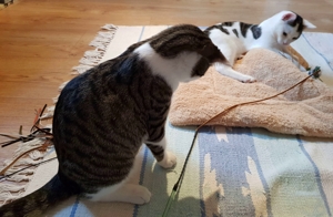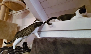 . Zum Glück ist unser Zimmer so gross, dass wir gefahrlos unsere Energie beim Herumflitzen loswerden können, rauf auf den einen Kratzbaum, runter, quer durchs Zimmer, rauf auf den zweiten Kratzbaum… und alles wieder von vorne! Schaut Euch mal das Video an, das ist nur ein kleiner Ausschnitt