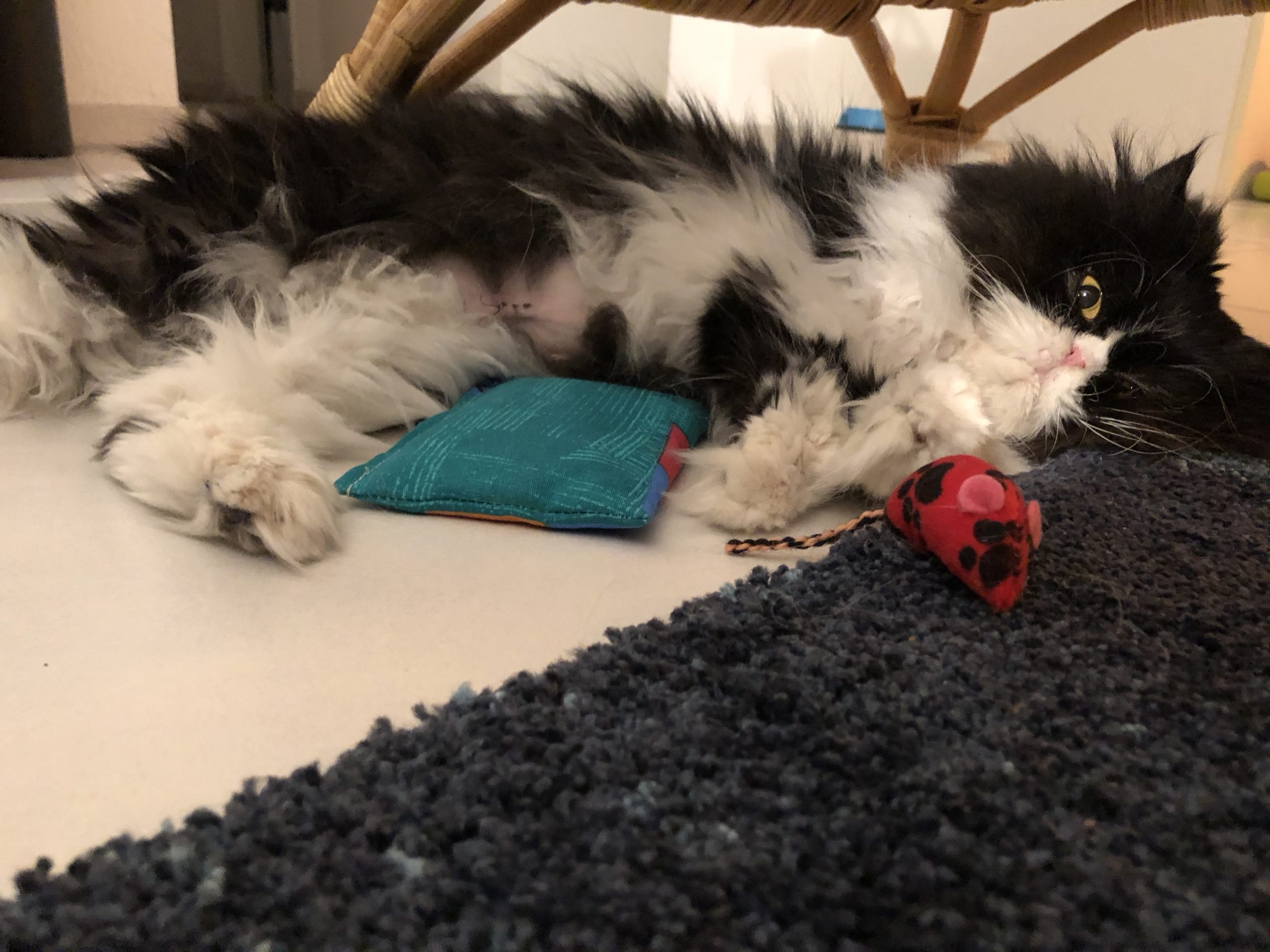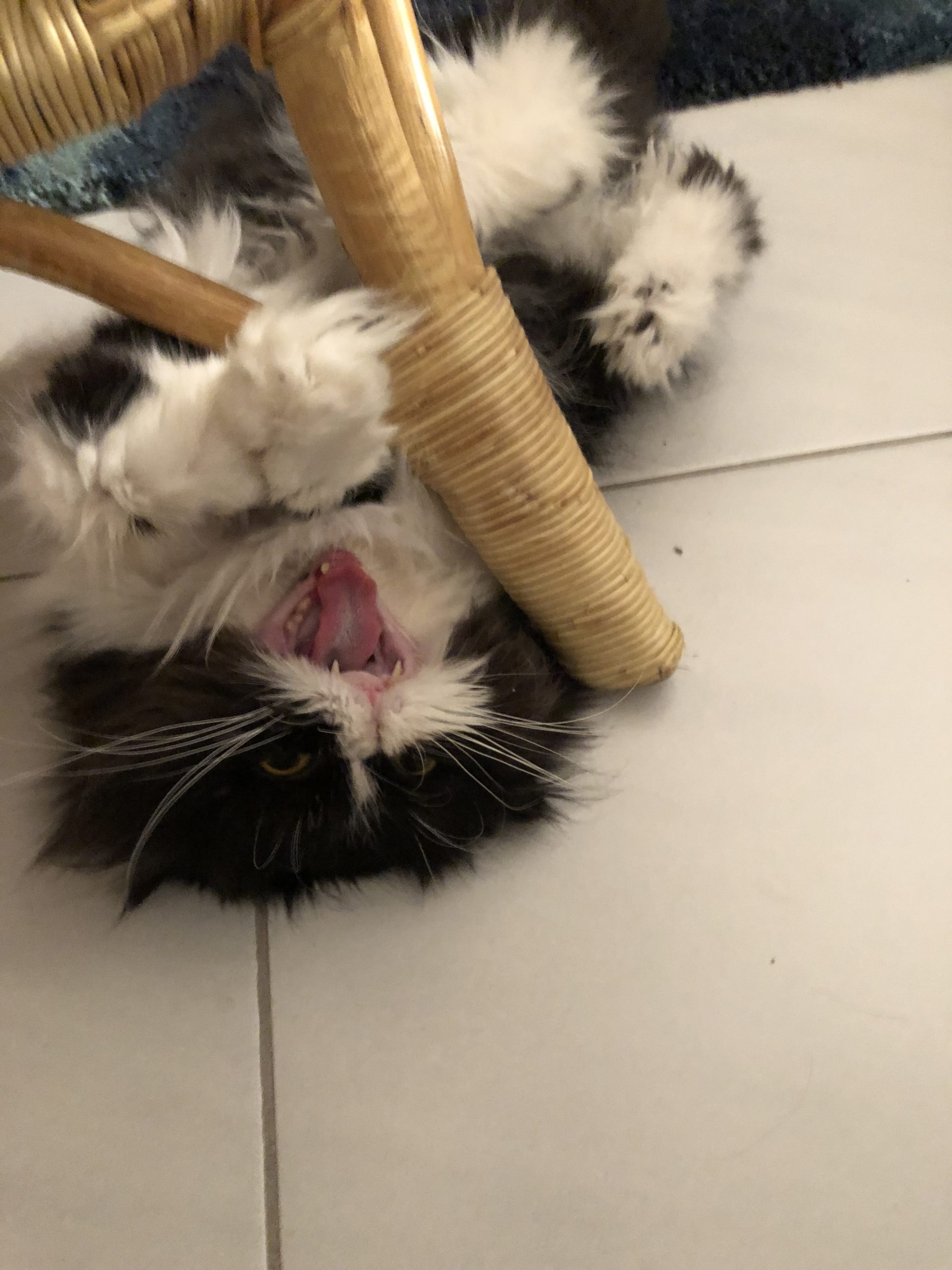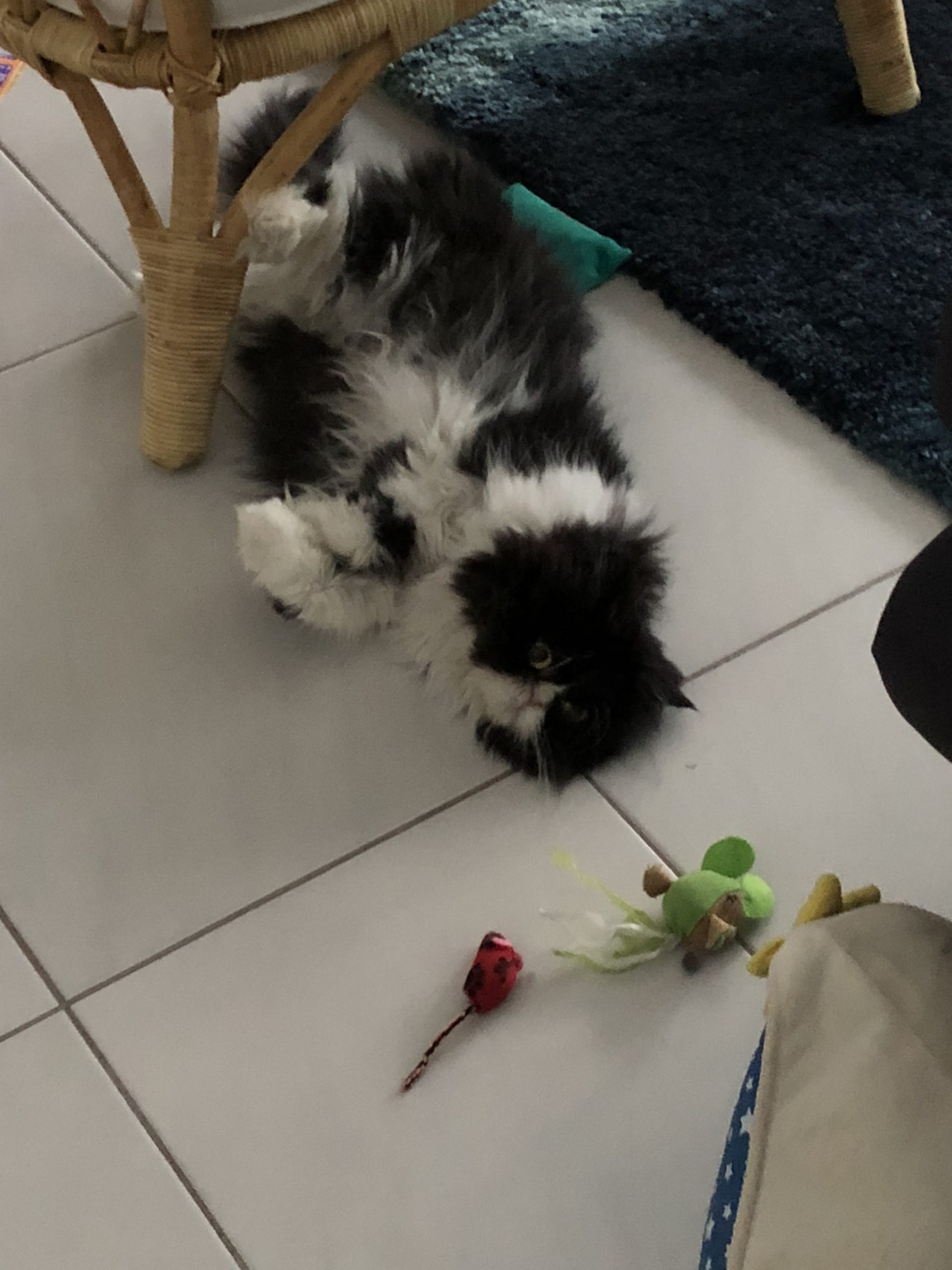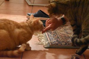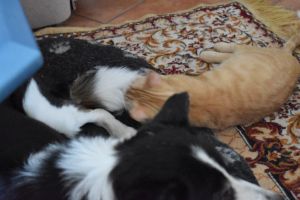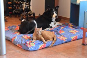 Am Nachmittag wurden wir wieder von Bruno abgeholt und zuhause in (unser Zimmer) gebracht, freigelassen und endlich gab es was zu futtern! Nach über zwei Stunden kam Bruno wieder heim, gab uns wieder Futter und wir durften uns wieder frei in der ganzen Wohnung bewegen