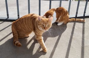 Auch mit ihrem Kumpel verstehen sich die beiden super. Sie toben gerne zusammen durch das grosse Haus. Vor allem nachts machen sie gern Party und jagen durch die 3 Etagen, die ihnen zu Verfügung stehen