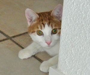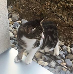 . Tiuri geniesst mittlerweile Freigang. Doch ist er draussen noch ziemlich unsicher und getraut sich noch nicht weiter als in den Garten. Dort schaut er gerne den Kaninchen zu. Als er das erste Mal nach draussen durfte, brauchte er fast 3 Stunden bis er es wagte, ganz rauszugehen