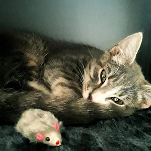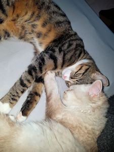 . Kaya geht dann meisten erst nach Joshi in aller Ruhe fressen. Er schmust gerne mit seinen Menschen und ist sehr gerne in ihrer Nähe. Nachts dürfen er und Kaya bei ihren Menschen im Bett schlafen. Joshi hat, bis jetzt, selbst noch keine Mäuse nach Hause gebracht. Doch liebt er es mit den mitgebrachten Mäusen von Kaya zuspielen