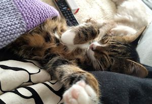 Tinka ist sehr gerne im Mittelpunkt und es geht nicht lange, da sass das süsse Tricolormädchen schon auf meinem Schoss und liess sich ausgiebig streicheln. Yaro beobachtet das Ganze von der Seite, er drängt sich nicht so gerne in den Mittelpunkt. Tinka kann auch mal rumzicken wenn sie das Gefühl hat sie sei zuwenig der Mittelpunkt. Beide verstehen sich super und spielen oder kuscheln sehr gerne zusammen. In der Nacht dürfen beide bei ihren Menschen schlafen. Yaro ist der Frühaufsteher und gibt den Ton an wenn er Frühstück haben möchte. Beide sind super lieb und stellen selten Unfug an