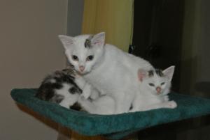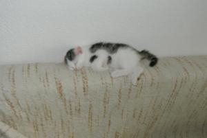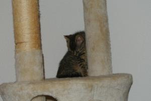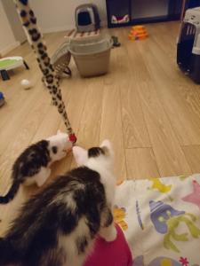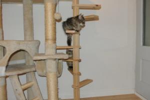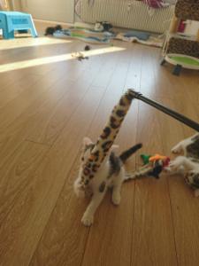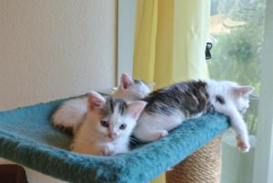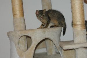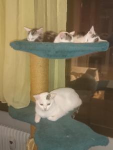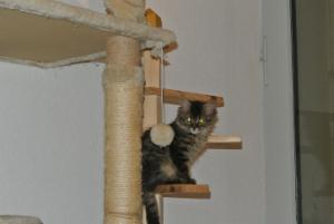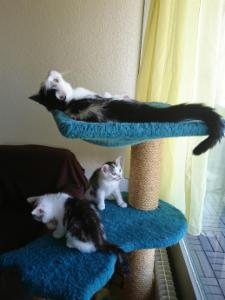 Meine drei Kätzchen sind nun schon ziemlich gross und es kommt ihnen immer wieder etwas in den Sinn. Am Morgen kuscheln wir meisten zusammen auf dem Kratzbaum bis es Frühstück gibt. Die Kleinen mögen manchmal gar nicht warten und nehmen dann von mir noch etwas Milch zur Stärkung. Wir toben auch sehr gerne durch die Wohnung. Finnya findet Bälle super