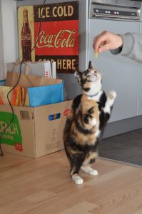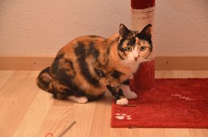 Ayosha war da skeptischer und liess sich anfangs nur mit Leckerlis von „gekochten Nudeln“ von unserem Besuch überzeugen. Schnell merkte sie, dass ihr nichts geschieht und schon stand sie da – nicht unbedingt üblich für die kleine Maus, denn sie scheint sich vor weiblichem Besuch eher zurück zu ziehen, wie vor männlichem… Uns gegenüber war sie schnell offen und zutraulich und fand, dass Schmusen schön ist. Sie ist sicherlich die Skeptischere von beiden, doch auch sie lässt sich gerne streicheln und lieb haben