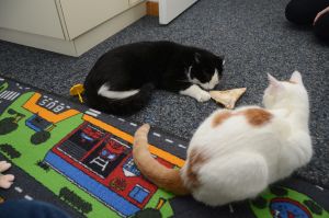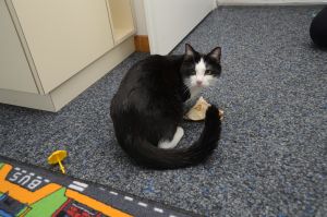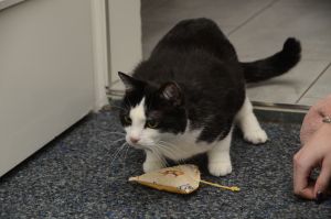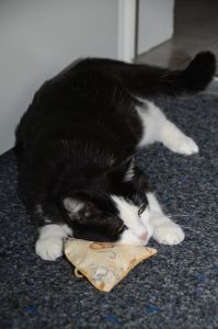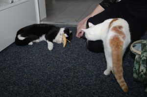 Das mitgebrachte Stinkie schien sie so lange zu ignorieren, bis Mogli (auch durch uns vermittelt) auf den Plan kam! Er interessierte sich sogleich dafür und spielte damit herum. Das passte der kleinen Maus gar nicht und sie versuchte Mogli mit ihren Pfötchen vom Spiel abzuhalten, was ihr nicht gelang. Mogli genoss das Stinkie – doch wie wir später sahen auch unsere süsse Belle