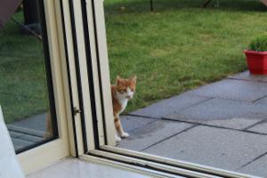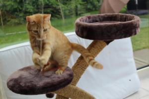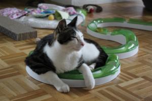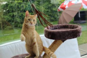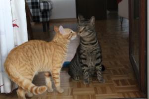 ! Norek tauchte als erster wieder auf der Bildfläche auf und nach einem prüfenden Blick, hatte man das Gefühl, dass er noch wusste wer ich war. Mit Leckerlis war das Eis dann gebrochen und das Knuddeln konnte er dann doch geniessen. Suna kam irgendwann auch wieder aus ihrem Versteck und zog sich an ihren Lieblingsplatz im Garten zurück. Zum Spielen war es noch ein paar Stunden zu früh.