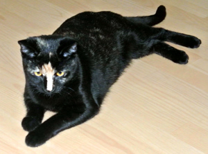 Cookie und Pie sassen auf der Treppe als ich kam. Donut kam sofort und flanierte um meine Beine und liess sich sofort streicheln. Nur Keks zeigte sich nicht gleich. Donut ist sehr anhänglich und kuschelt gerne