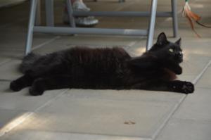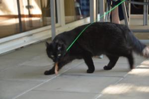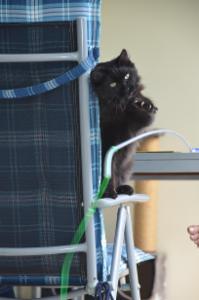 Dschingis war auf der Terrasse als wir kamen und genoss das schöne Wetter mit seinem Katzenkumpel Nigali. Als er unsere Stimmen erkannte wurde er vorsichtig und machte grosse Augen. Er verschwand auch ganz kurz ins Wohnzimmer, da er der Situation nicht traute. Doch seine Neugierde war grösser und da er sehr gerne mit der Angel spielt, war es für sein Besitzer einfach ihn wieder auf die Terrasse zu locken. Dschingis entspannte sich und wir durften ihn bewundern