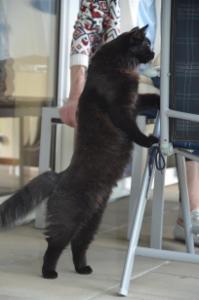 Dschingis lässt sich überall genüsslich fallen und rutscht dann zu Boden. Egal am Katzennetz oder am Körper seines Besitzers, es ist einfach seine Art sich hinzulegen. Wir lachten einige Male während unseres Besuchs, denn es sieht so lustig aus, wenn er dies tut.