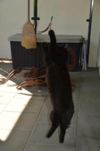 Er trägt auch die Spielangel in seinem Mäulchen herum und zieht daran wie ein Hund, wenn sie irgendwo hängen bleibt. Er tut dies mit viel Ausdauer und wir mussten lachen, als er uns dies vorführte.