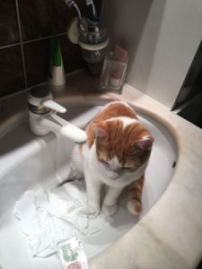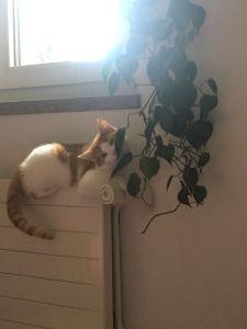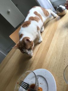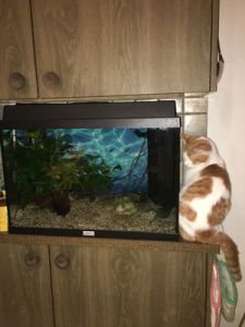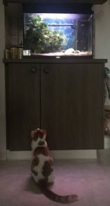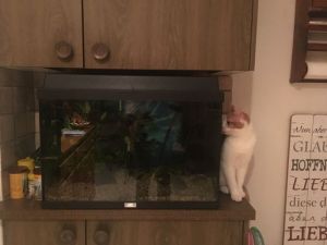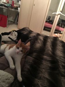Anja begleitete mich ins Wohnzimmer wo wir Platz nahmen und sie mir Geschichten über die beiden Kater erzählte. Wie zum Beispiel, dass einmal einer von den beiden ins Aquarium fiel oder wie sie bei der Ankunft in der ersten Nacht das Badezimmer verwüsteten