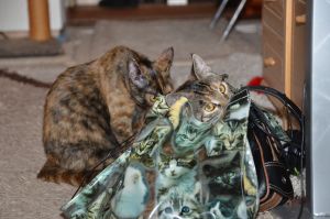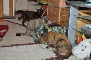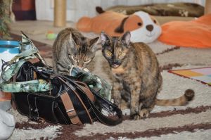 Die zwei haben sich ein Hobby ausgesucht und zwar, dass sie kleine Dinge die auf dem Tisch oder der Küchenkombination liegen, mit ihren Pfötchen herunter schmeissen, damit sie ihre Besitzerin wieder aufheben kann.