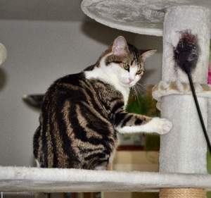 Kaara hat sich sehr gut eingelebt und sich sowohl mit ihren 4-beinigen Gspänli arrangiert wie auch gegenüber den Menschen geöffnet. Sie spielt sehr gerne, vor allem mit Pingpong Bällchen oder mit dem rot-grauen „Haarmonster“, das ihr die Pflegemama mitgegeben hat. In letzter Zeit hat sie sich mit Roxy, dem anderen Katzenmädchen im Haus angefreundet und läuft ihr zeitweise auf Schritt und Tritt nach, so dass es Roxy manchmal fast zuviel wird