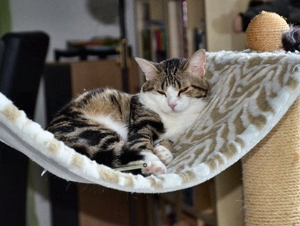 Morgens, wenn ihre Besitzer aufstehen, wartet sie oben, läuft ihnen nach unten voraus, schaut aber immer wieder zurück um sicher zu sein, dass sie ihr auch folgen. Sie bewegt sich inzwischen ganz selbstsicher im ganzen Haus, liebt es zu klettern und sprintet ganz nach oben auf den Kratzbaum.