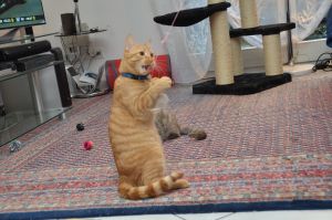. Erst kürzlich fand er bei Schnee, dass es super wäre auf dem Dach des Wintergartens herum zu spazieren, doch bedachte er nicht, dass er keine Spikes trägt