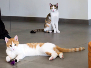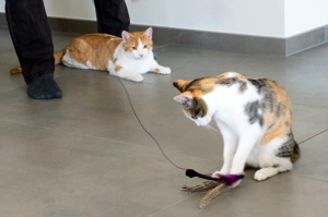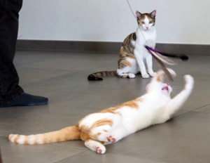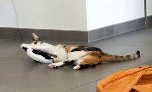 Phelps ist ein wunderschöner rot-weisser Kater mit einer schier unglaublichen Energie. Er spielte unermüdlich mit den mitgebrachten Sachen, vor allem aber mit einem einfachen kleinen Filzball. Als dann noch sein Besitzer mit der Federangel kam, gab es kein Halten mehr