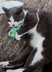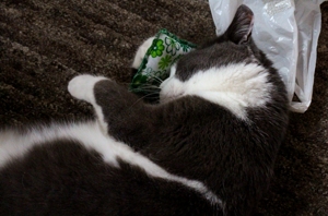 Der mitgebrachte Raschelsack zog Neo wie magisch in seinen Bann, er fischte sich daraus zuerst einen Filzball, diesen jagte er durch die ganze Wohnung. Auch das Baldriankissen wurde seinem Ruf gerecht. Neo liebte es! Die quiekende Maus aus dem Sack beeindruckte ihn schwer und so war Neo die ganze Zeit beschäftigt, er kann sich super gut selbst bespielen
