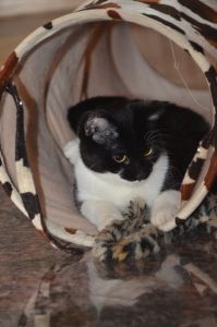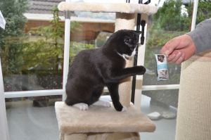 Sindi lag auf der Kratztonne als wir eintraten und schnupperte uns neugierig ab. Das mitgebrachte Stinkie fand sie toll und spielte sogleich genüsslich herum. Kimi war dagegen doch einiges zurückhaltender und zog es anfangs vor sich in der oberen Etage aufzuhalten. Seine Besitzer kennen den süssen Kater jedoch gut und erzählten uns, dass es sicher nicht lange dauert und er sich zeigt. Kurze Zeit später war Kimi da. Anfangs noch vorsichtig, doch schon kurz darauf war er der Kimi den wir kannten