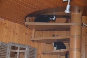 Als wir nach Geschichten über die beiden Büsi fragten erfuhren wir, dass die beiden oftmals Sachen irgendwo runter schmeissen. Alle Pflanzen wurden daher auf höhere Ebenen in Sicherheit gebracht und dennoch probierte Sindi aus, ob sie sie erreichen kann, was ihr einen Freiflug nach unten bescherte. Von einigen anderen Gegenständen trennten sich die Besitzer gezwungenermassen…