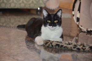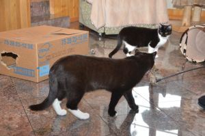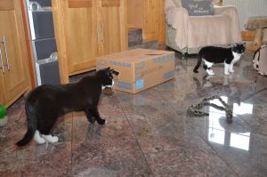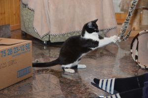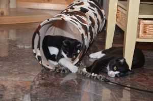 Sindi verschwand auch kurz, um nachzuschauen was los ist, kehrte jedoch schon bald darauf zurück. Zusammen mit der Besitzerin bespassten wir die beiden Katzen im Wohnzimmer mit der Spielangel. Die hatten Freude und genossen die Aufmerksamkeit.