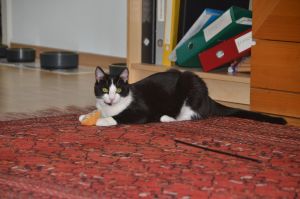 Sylvester ist zwar der scheuere von beiden, dafür der frechere. Er spielt sehr gerne mit Dekosteinen oder wirft Sachen auf den Boden. Dabei spielt es ihm keine grosse Rolle was er erwischt. Feuerzeuge, Kugelschreiber, Teller… Mit allem kann er etwas anfangen