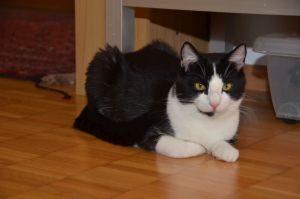Sylvester ist sehr sensibel und geht gerne kuscheln. Am Morgen liegt er gerne auf den Beinen und gibt Liebesbisschen.