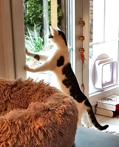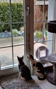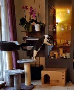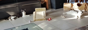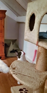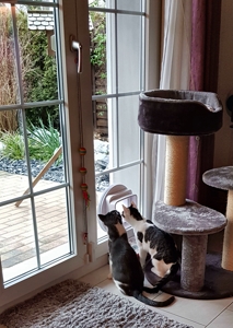 . Wir durften wieder im Haus herumflitzen und uns austoben. Spannend fanden wir vor allem das neue Vogelhaus, das plötzlich draussen auf der Terrasse stand. Wir beobachten seither ganz fasziniert die vielen Vögel, die sich das Futter holen. Die sitzen dann alle im Baum und fressen, da ist richtig was los. Könnten wir die doch fangen