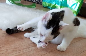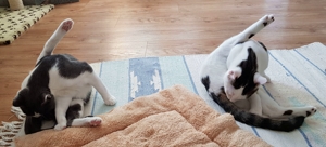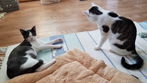 ? Ist doch komisch, oder? Dann sind auch unsere Transportboxen, die immer offen im Zimmer standen, nicht mehr da. Das Pflegemami sagte uns, dass wir am Sonntag von unseren neuen Besitzern abgeholt würden. Kann uns jemand sagen, was das bedeutet? Wir werden ja sehen. Bis dahin geniessen wir jedenfalls die letzten Stunden hier und natürlich unser Pflegemami, das derzeit ganz besonders lieb zu uns ist