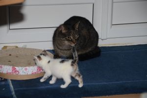 Jeannie, die Kätzin von Manu, hat übrigens auch begonnen uns ein wenig zu erziehen. Sie findet Jungspunde sonst nicht so toll und geht ihnen aus dem Weg, aber Manu beobachtet, dass sie häufiger im Wohnzimmer anzutreffen ist als sonst und das sie mit einem wachsamen Auge auf uns schaut.