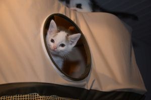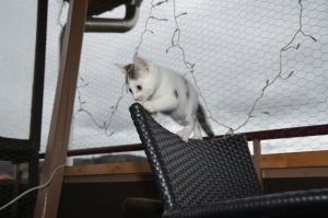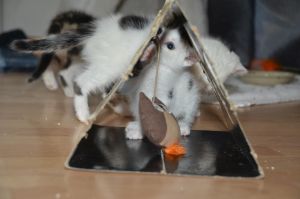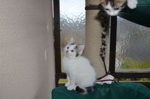Mit den anderen grossen Katzen ist es überhaupt kein Problem. Nayati schläft bei uns und wir dürfen uns an ihn kuscheln, Jay versucht uns auszuweichen, da er uns Kleinen nicht traut, Beauty leckt uns manchmal ab und stellt sicher, dass wir saubere Kitten sind. Jeannie hilft bei unserer Erziehung, Maiky ist auch eher der feige Typ der sich verdünnisiert, wenn wir kommen und Aladdin ist einfach Aladdin. Er beschnuppert uns und sobald wir auf ihn zugehen, nimmt er Reissaus